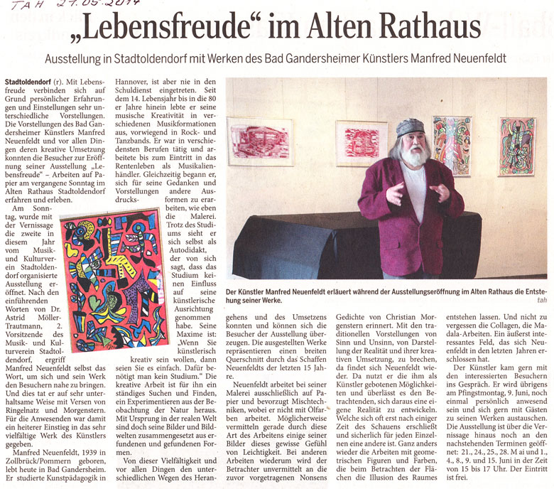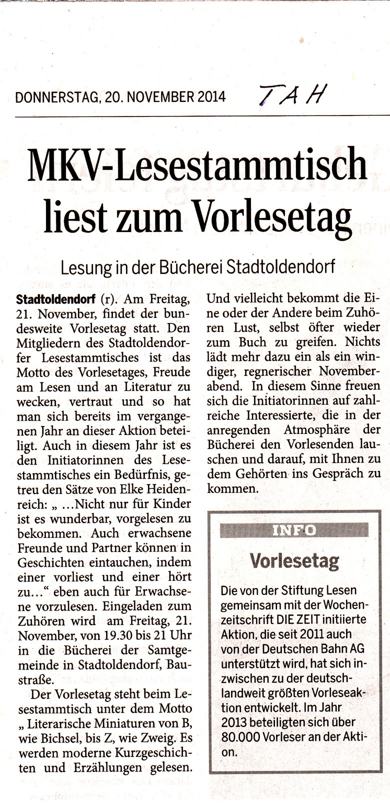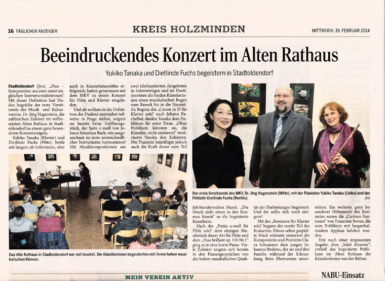 Nikolaus Schilling - Kleinkunst in Reinstform MKV mit Rezitationsabend erfolgreich in Saison gestartet Die neue Veranstaltungssaison des Musik- und Kulturvereins Stadtoldendorf e.V. (MKV) eröffnete ein außergewöhnlicher Rezitationsabend. Bereits zum zweiten Mal konnte der Vorstand des MKV, den bundesweit renommierten Schauspieler Nikolaus Schilling, für diesen Abend gewinnen. Über TV- und Kinoproduktionen hinaus, hat er sich einen Namen als außerordentlicher Eugen Roth-Kenner gemacht. Selten ist das Alte Rathaus so gefüllt, noch seltener, wenn reines Sprechtheater auf dem Programm steht. Umso erfreulicher, dass so viele Zuschauer sich diese Art der Kleinkunst in Reinstform nicht entgehen lassen wollten. Einen Menschen nach Roth-Manier, verkörperte Schilling an diesem Abend wahrhaftig, mit aller Kraft und Zerbrechlichkeit, die das Menschsein ausmacht. Und trotz aller Leichtigkeit des Humors, ergriff diese Authentizität das Publikum. Die kleinen Alltäglichkeiten, die uns regelmäßig scheitern lassen, sind das Thema, der Roth’schen Reime. Seine Autorenkollegen Wilhelm Busch und Joachim Ringelnatz ließen sich ebenfalls vom Menschsein inspirieren. Alle drei lieferten die Texte des Scheiterns, aus denen es Schilling verstand, den Zuschauern, unter reichlich Applaus und Gelächter, einen vergnüglichen Abend zu verschaffen. Nikolaus Schilling – einer der letzten Mimen alter Schule, der das klassische Handwerk so uneingeschränkt beherrscht, dass echtes Menschsein hervorbricht. Auf den Geschmack gebracht, hatte das Publikum die Gelegenheit, selbst in den Texten zu schmökern. Der MKV arrangierte zusammen mit dem Fachgeschäft „Büro Direkt“ einen Büchertisch mit zahlreichen unterschiedlichen Ausgaben der Autoren. Ohne Übertreibung kann von einem seltenen Kulturereignis und gelungenen Saisonstart berichtet werden. Dem Vorstand ist es gelungen, wieder ein vielfältiges Angebot zusammenzustellen. Geboten wird z.B. Musikalisches von der TourneeOper Mannheim, dem Ensemble Vokabilè, der Stormy-Weather-Band oder Hein Brüggen. Die Chöre des MKV bestreiten ein Weihnachts- und Sommerkonzert. Für junge Bildende Künstler wird, in Kooperation mit dem Landschulheim Holzminden, die Ausstellungsreihe für Schüler fortgeführt. In der Sparte Sprechtheater organisiert der Verein eine Kinderlesung und die Homburg-Bühne bereitet „Loriot’s Dramatische Werke“ mit Bekanntem und Neuem vor. Online-Bericht Weser-Ith_news: >>> |